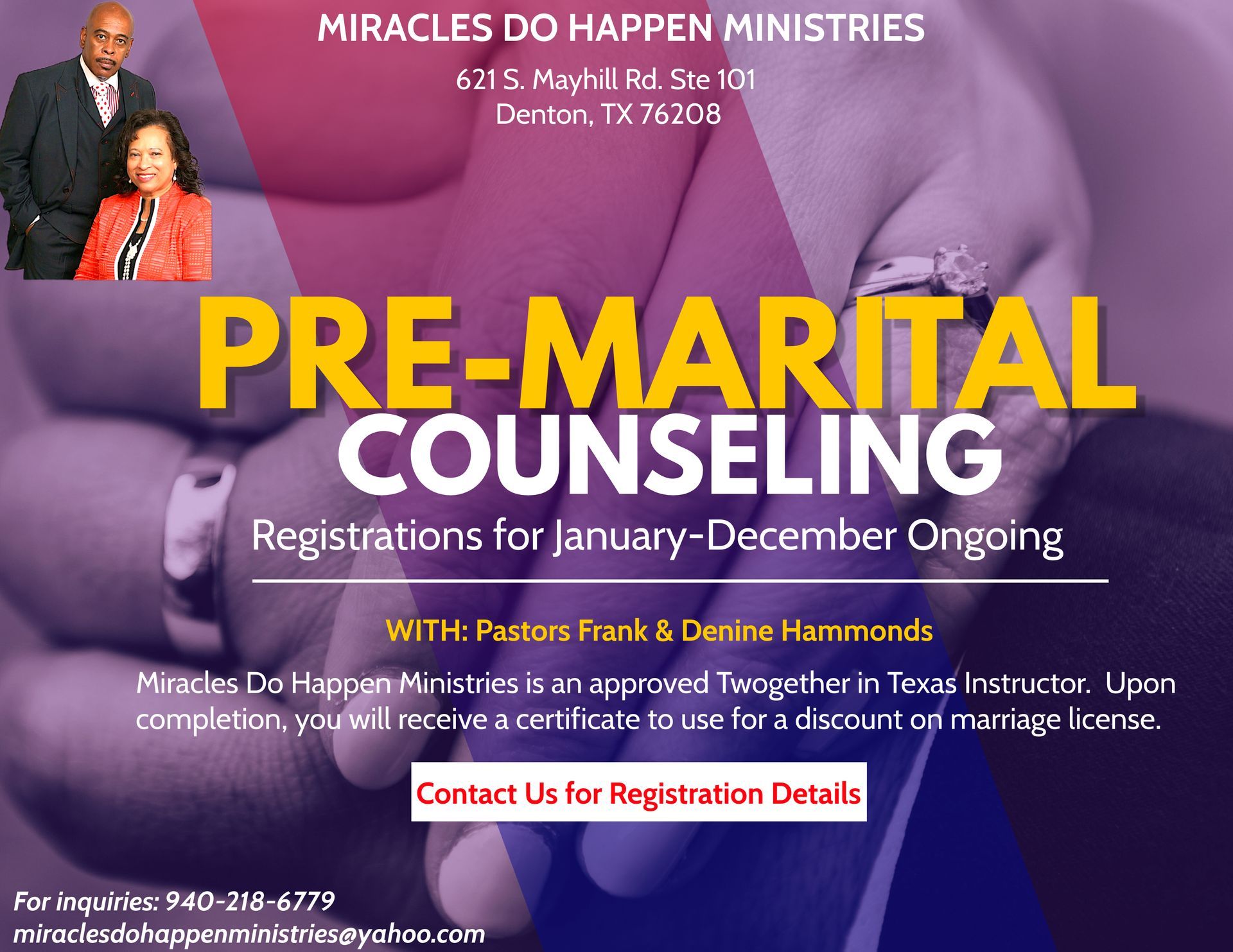 Note that we do require eight one hour sessions and will discuss marriage from both a natural and spiritual perspective.